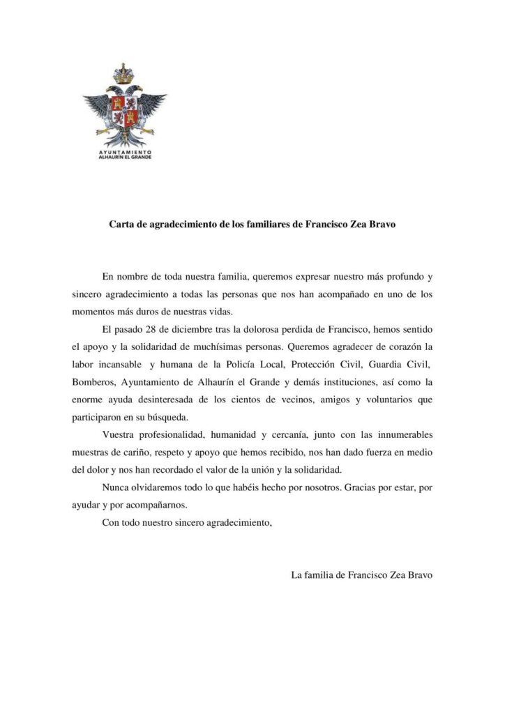 Las familias de Antonio Morales Serrano y Francisco Zea Bravo, a través del Ayuntamiento de Alhaurín el Grande, quieren agradecer públicamente la solidaridad, colaboración e implicación de todas las personas voluntarias que participaron de manera altruista en su búsqueda.
