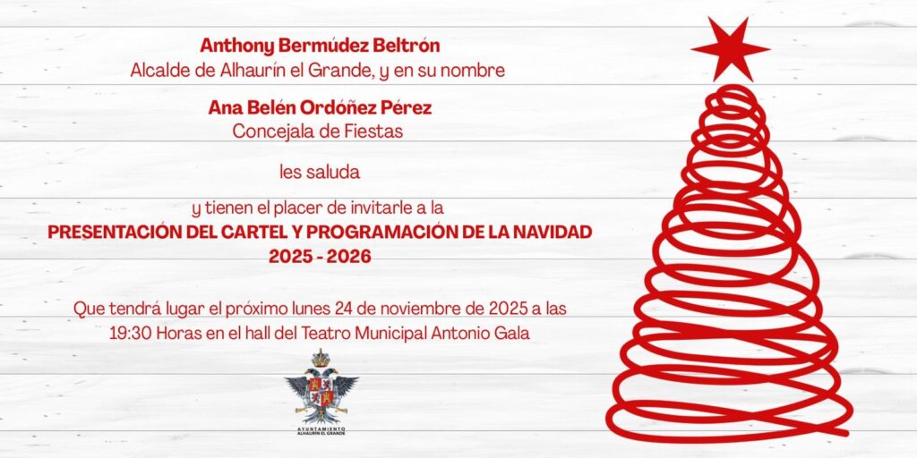 El próximo lunes 24 de noviembre, el Ayuntamiento de Alhaurín el Grande llevará a cabo la presentación oficial del programa navideño 2025-26, un acto abierto al público que se celebrará a las 19:30 horas en el hall del Teatro Antonio Gala. Durante esta presentación, la concejala de Fiestas, Ana Belén Ordóñez, dará a conocer todas las actividades y eventos previstos para estas fiestas, pensados para todos los públicos y para disfrutar en familia.