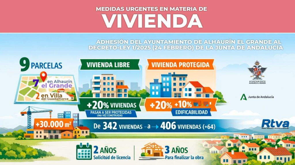 Desde el Ayuntamiento de Alhaurín el Grande se subraya que esta medida se suma a otras iniciativas impulsadas por el equipo de gobierno en materia de vivienda, como la actualización del Plan Municipal de Vivienda o la puesta en marcha de subvenciones para la rehabilitación y mejora de viviendas en el municipio. Con todo ello, el Consistorio reafirma su compromiso de seguir trabajando para ofrecer soluciones a uno de los principales retos que afrontan actualmente los vecinos y vecinas del municipio.