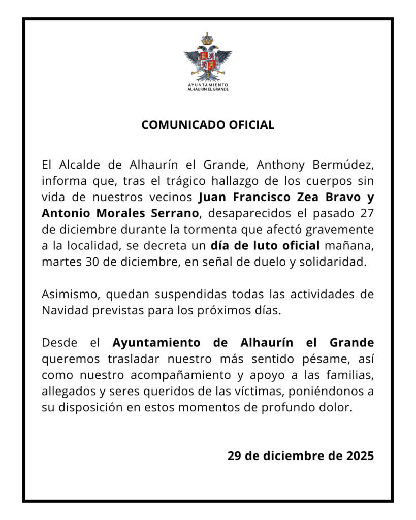 El Alcalde de Alhaurín el Grande, Anthony Bermúdez, informa que, tras el trágico hallazgo de los cuerpos sin vida de nuestros vecinos Juan Francisco Zea Bravo y Antonio Morales Serrano, desaparecidos el pasado 27 de diciembre durante la tormenta que afectó gravemente a la localidad, se decreta un día de luto oficial mañana, martes 30 de diciembre, en señal de duelo y solidaridad.