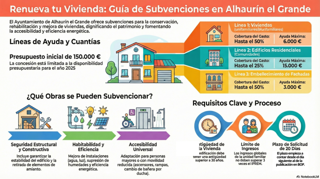 Las personas interesadas pueden consultar toda la información y bases reguladoras en la sede electrónica del Ayuntamiento de Alhaurín el Grande, dentro del apartado de subvenciones, así como recibir atención y asesoramiento presencial en el Área de Vivienda, en la Casa de la Cultura, y en el Área de Urbanismo del edificio del Ayuntamiento.