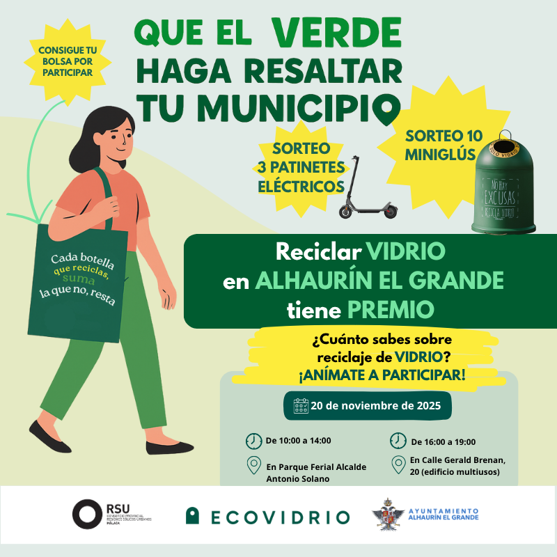 El Ayuntamiento de Alhaurín el Grande se une a la nueva campaña de sensibilización medioambiental impulsada por Ecovidrio —la entidad sin ánimo de lucro encargada de la gestión del reciclado de los residuos de envases de vidrio en España— y el Consorcio Provincial de Residuos Sólidos Urbanos de Málaga. Esta acción recorrerá 11 municipios malagueños, entre ellos Alhaurín el Grande, con el objetivo de fomentar la recogida selectiva de vidrio y reforzar el compromiso ciudadano con la sostenibilidad.