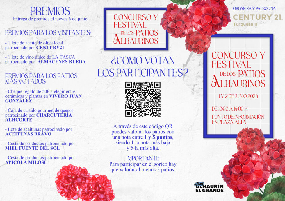 Alhaurín el Grande celebrará durante los días 1 y 2 de junio la primera edición del Concurso y Festival de los Patios Alhaurinos. Una iniciativa de la empresa Century 21 con la colaboración de las concejalías de Turismo y Desarrollo Económico del Ayuntamiento de Alhaurín el Grande y otras empresas locales, que pretende dar a conocer el importante valor patrimonial y cultural del que dispone la localidad, con tesoros aún por descubrir como son sus patios y calles tradicionales del casco histórico.