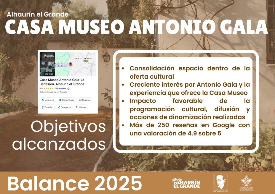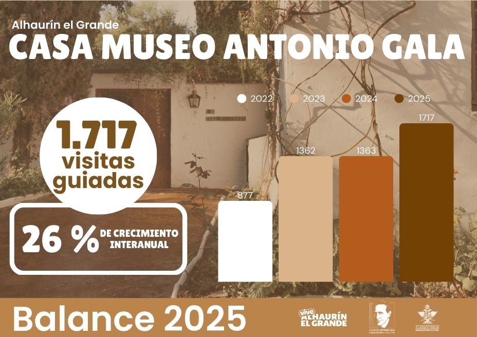 La Delegación de Cultura del Ayuntamiento de Alhaurín el Grande ha presentado el balance anual de la Casa Museo Antonio Gala La Baltasara correspondiente a 2025, un ejercicio que se cierra con 1.717 visitas guiadas, el mejor dato registrado desde su apertura, consolidando una tendencia claramente ascendente y situando al espacio en un momento de madurez y proyección de futuro muy favorable.