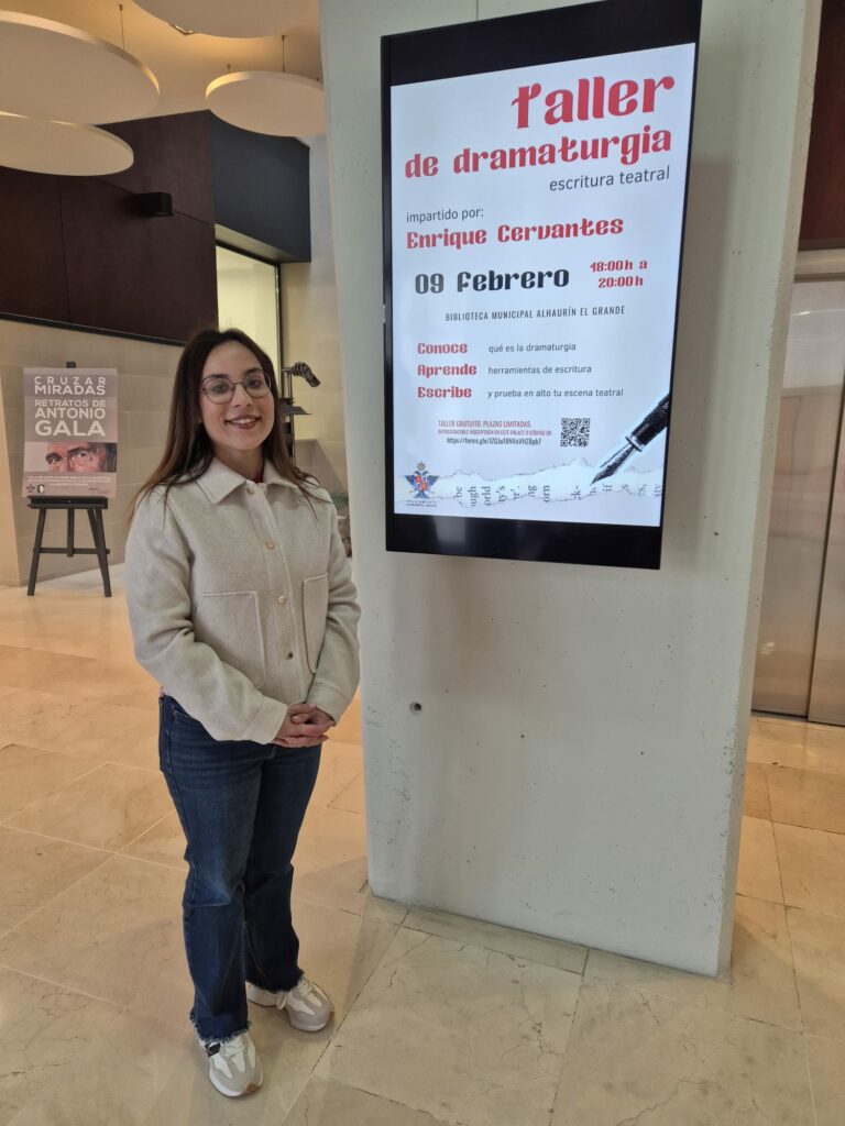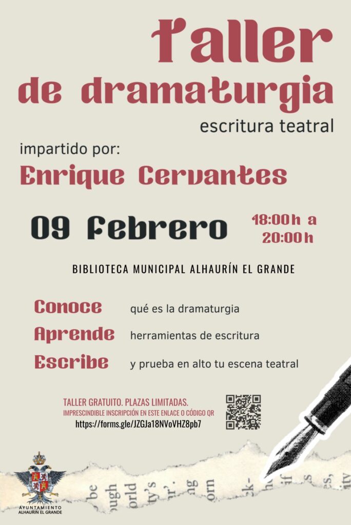 La Delegación de Cultura del Ayuntamiento de Alhaurín el Grande pone en marcha un taller de dramaturgia y escritura teatral, que se celebrará el 9 de febrero, de 18:00 a 20:00 horas, en la Biblioteca Municipal. Esta actividad es gratuita, para mayores de 16 años y tiene plazas limitadas que requieren inscripción previa.