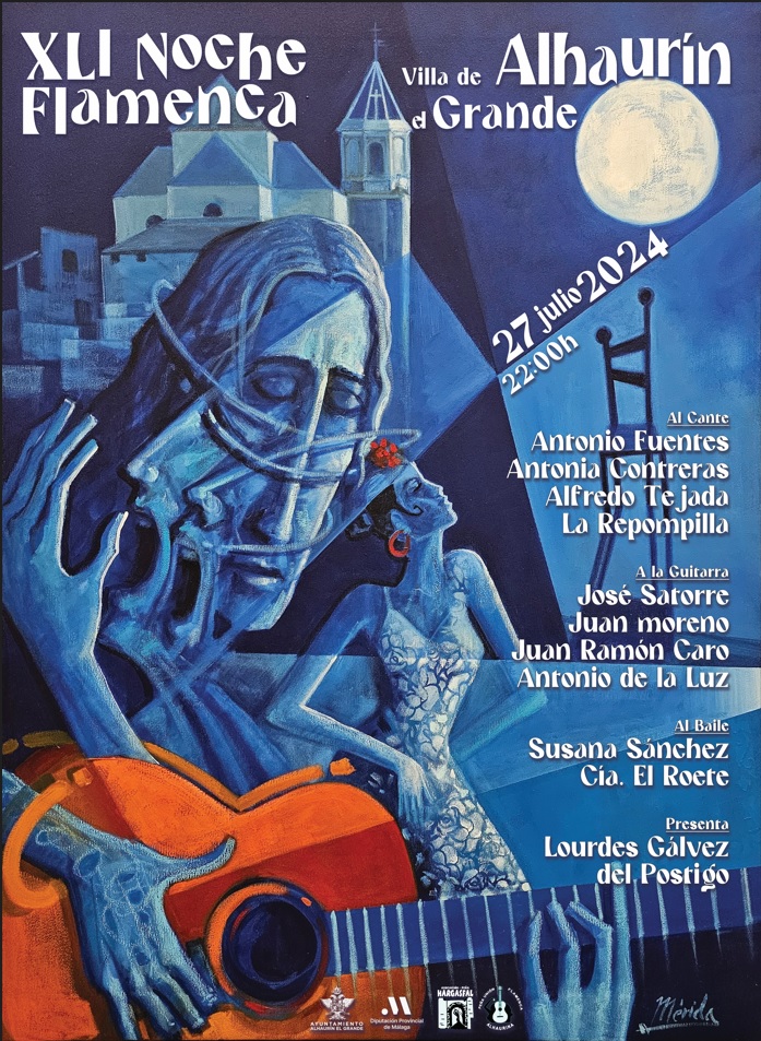 Sus motivos taurinos y flamencos son una constante en su obra, y como puede contemplarse en el cartel, recrea el arte del cante y el baile o los instrumentos, como la guitarra. La atmósfera de cualquier obra de Andrés Mérida está llena de luz y sombra, rupturas, figuras dinámicas y casi siempre con un color dominante, en este caso el azul intenso que acontece a la noche. Malagueño de elección, ha realizado recientemente el cartel de la Semana Santa de Málaga de 2021 o la Corrida Picassiana de 2022.