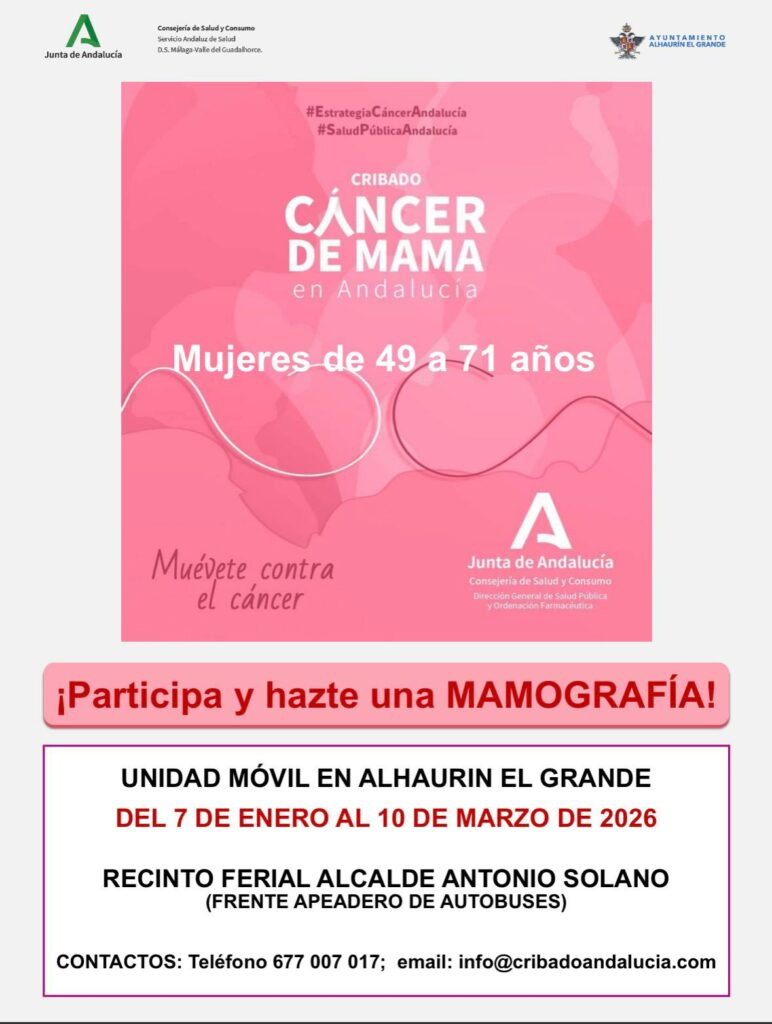 La unidad móvil de la Campaña de Detección Precoz del Cáncer de mama estará presente en Alhaurín el Grande entre el 7 de enero y el 10 de marzo de 2026. El dispositivo se ubicará junto al Teatro Municipal Antonio Gala, frente al apeadero de autobuses, con el fin de facilitar el acceso a las mujeres citadas.